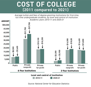 Average tuition and fees of degree-granting institutions for first-time, full time undergraduate students, by level and control of instituion. Academic years 2010-11 and 2020-21.